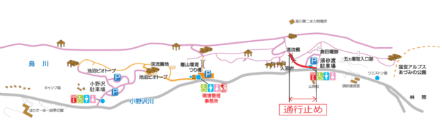 水辺エリア清流橋付近の工事実施に伴い、須砂渡駐車場及び清流橋の利用を制限させて頂き、一部園路に迂回路を設け通行規制しています。