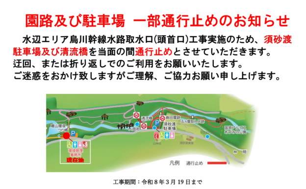 水辺エリア清流橋付近の工事実施に伴い、須砂渡駐車場及び清流橋の利用を制限させて頂いております。